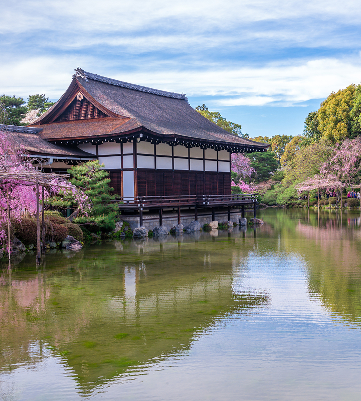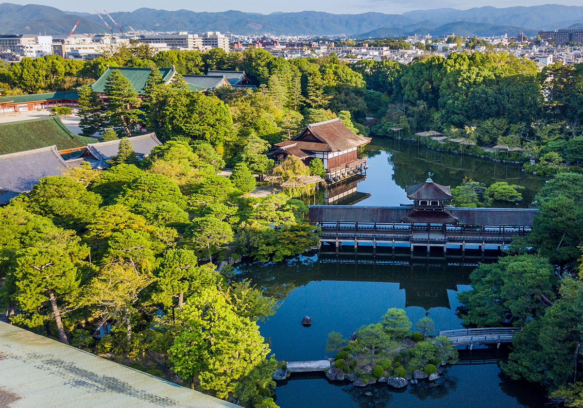 Next to the vermilion halls of Heian Shrine, Heian Jingu Kaikan overlooks Shin’en garden,