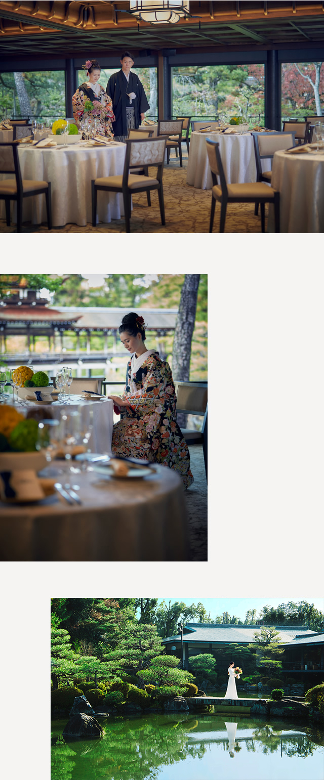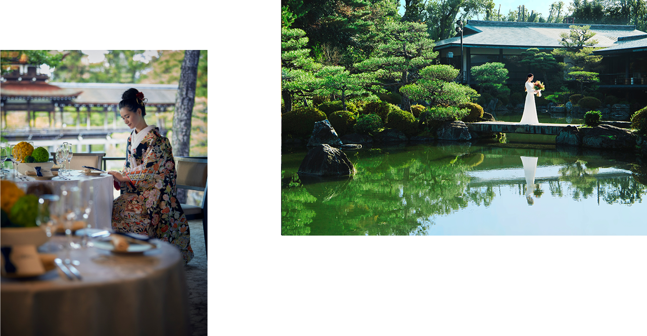 真正面に広がる栖鳳池と、その周りを囲む樹々。栖鳳殿からしか見ることのできない絶景をゲストにお楽しみいただけます。