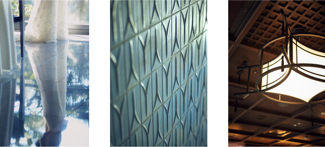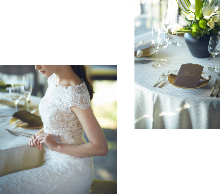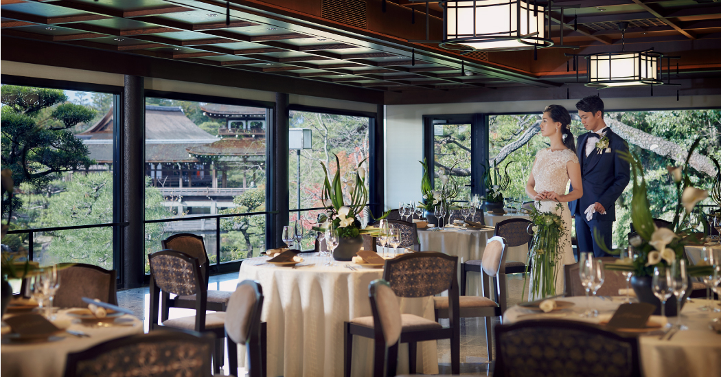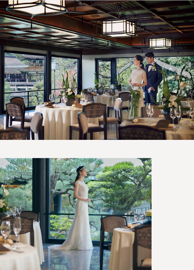 栖鳳池と呼応するかのように、床面の御影石には神苑の緑と美しいドレスが映り込みます。