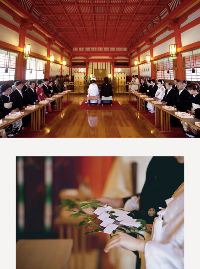 式次第に沿って執り行われる、本格的な神前式。神さまの御前で、新しい家族の末永い幸せをお祈りします。