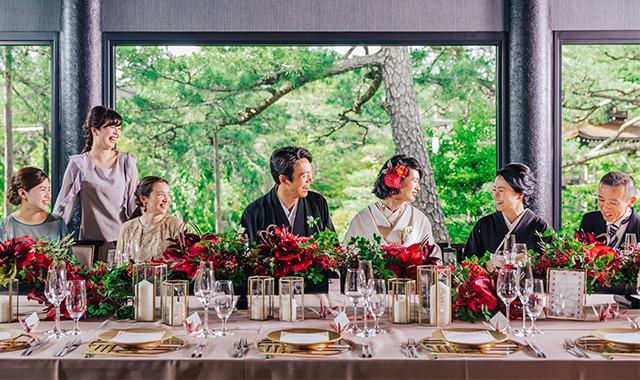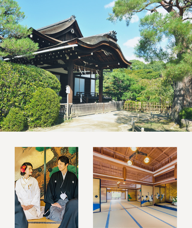 京都御所から移築された尚美館は、大切なゲストをお迎えするのにふさわしい場所。金地の襖絵には、鶴・松・竹・梅が描かれています。本殿で挙式を挙げたおふたりは、この場所でご両家顔合わせを行います。